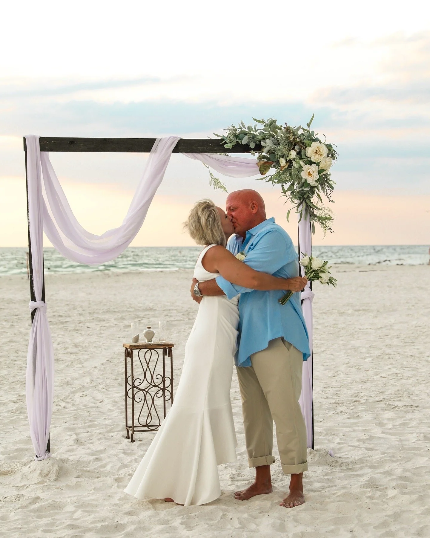 Karen and Bryan’s Clearwater Beach elopement was an absolute dream to photograph. From the stunning arch setup on the beach to the romantic, intimate ceremony, everything about their day felt like it was straight out of a love story. The beach setting was perfect – the sun shining, the waves crashing gently in the background, and the peaceful energy of the ocean setting the tone for their celebration of love.
